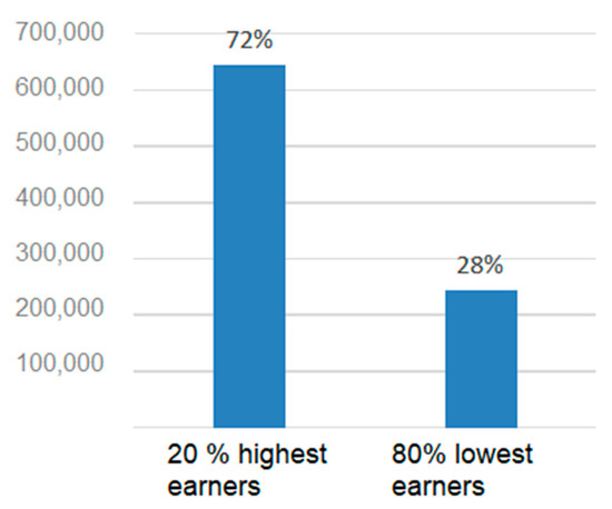 The REC entered in circulation in September 2018, with 82 affiliated businesses. These were mainly retailers who placed their trust in the program from its beginning, despite its novelty. As the REC system became established, the number of active affiliated businesses rose to 160 by 30 October 2019, including two wholesalers, plus 13 local entities (associations and foundations based in the area of implementation). The food sector rapidly became the predominant sector in the system, in terms of the number of affiliated businesses, revenue, and payments in REC. The revenue in REC in the food sector represented 74% of the total, followed by pharmacies (7%) and supermarkets (5%). The average revenues for active affiliated businesses throughout the period studied was 5559 REC, and the median was 2035 REC, suggesting a high concentration of revenue. Furthermore, 20% of the affiliated businesses received 72% of the revenue, as revealed in Figure 1.