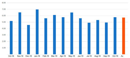 The REC’s velocity of circulation was calculated as the sum of transactions of each period divided by the average money supply of the period and multiplied by 12 to annualize the monthly values. An exception was made for the last value, where the velocity of circulation over the last 365 days was calculated as the sum of transaction volumes of this period (6 November 2018 to 6 November 2019) divided by the average money supply of the 365th day. Figure 3 shows the evolution of the velocity of circulation of the REC, which was on average 5.80 during the period of intervention. This value is 5–6 times higher than the M3 income circulation of the EUR, which was 0.9450 in the first quarter of 2018 (TTID 2018b), and also higher than the USD M2 velocity in the same period, which was 1.454 (TTID 2018a).