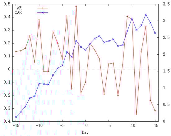 The cumulative abnormal return (CAR) helps us to understand the cumulative effect or the abnormal return in a specific period. In this paper, the average abnormal returns in a specific period during the observation period are summarized to obtain the average cumulative abnormal return, as shown in Equation (4):