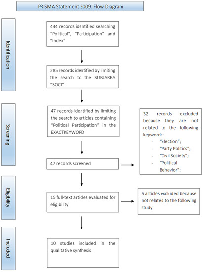 Once the participatory phenomenon has been defined, in order to be able to analyze it, it is necessary to use social indicators to study its complexity. The first phase to be followed in the construction of a social indicator is to have a solid theoretical framework, which allows us to have a clear view of the phenomenon to be measured (OECD 2008). This systematic research was carried out on the Scopus database, based on the approach proposed by the PRISMA Statement (Liberati et al. 2015), which allows us to trace all the steps of the selection of studies. The first phase followed was the identification of some keywords. These last ones have been chosen based on the scope of the search and, therefore, the following words have been inserted in the database “POLITICAL” AND “PARTICIPATION” AND “INDEX” narrowing the field to the articles containing such words in the title, the abstract and the keywords. This research returned 444 results. However, since they are so numerous that they cannot be analyzed in their entirety, the field has been further narrowed by limiting the research to the SUBJAREA “SOCI”. The following research yielded 285 results, showing that there are still too many papers to be examined. For this reason, the results were limited to those containing the term “POLITICAL PARTICIPATION” in the EXACTKEYWORD. Of the 47 resulting documents, 32 have been deleted, excluding all the works not related with the following keywords: “POLITICS”, “PARTY POLITICS”, “CIVIL SOCIETY”, “INDEX” and “POLITICAL BEHAVIOR”. Finally, of the 15 resulting documents, three were excluded as they were not related to the following study (Figure 1).