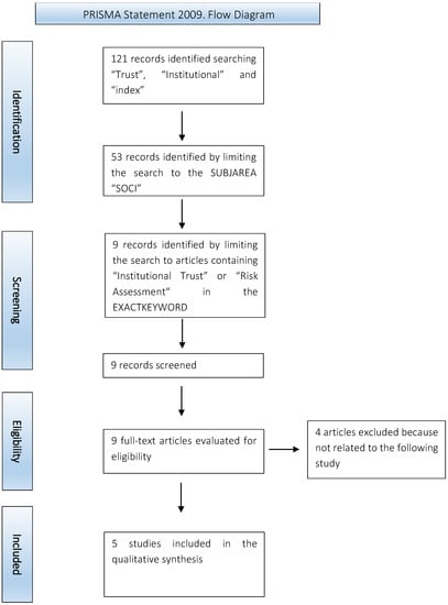 As already done for the political participation, some researches have been carried out on the database Scopus in order to construct the theoretical framework of reference. First, the following words “TRUST” and “INSTITUTIONAL” and “INDEX” were inserted into the Scopus database, narrowing the field to the title, abstract and keywords. In this way 121 results have been obtained: too many to be analyzed in its entirety. Therefore, the search was restricted to the SUBJAREA “SOCI”. The search yielded 53 results and, therefore, it has been limited further to the results containing the terms “INSTITUTIONAL TRUST” and “RISK ASSESSMENT” in the EXACTKEYWORD. Nine documents were thus obtained. Finally, four documents were excluded as they were not related to the following study (Figure 2).