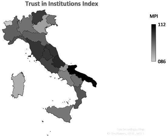 As with political participation, even in the case of trust in the institutions the territorial gap is not confirmed. In fact, as can be seen from Figure 4, the degree of trust in institutions is uniform in the Italian Peninsula. Although the values of the index may appear to show a high level of trust in institutions, if one analyzes the original data of ISTAT along with other reports such as the “Rapporto gli italiani e lo stato” (Rapporto 2019) it can be seen how the levels of trust in institutions are falling.