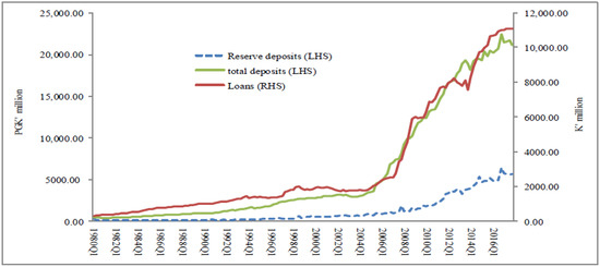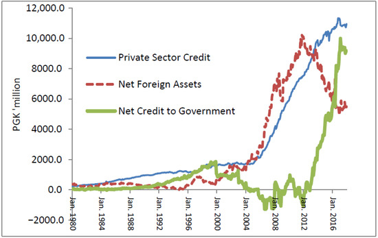 Other studies show that money supply components such as credit are driven by demand-side factors (Arestis and Sawyer 2002). This argument has been widely tested, with mixed results, suggesting that there might be merit in revisiting the money targeting monetary policy practices particularly in developing and emerging economies. It is argued that the simplifying assumptions that produced money multipliers are justified in financial systems with administratively controlled interest rates and limited availability of substitutes for money (Baghestani and Mott 1988). For instance, Bhatti and Khawaja (2018) showed the long-run relationship between broad money and the monetary base to be stable for Kazakhstan. Tule and Ajilore (2016) found similar results confirming the necessary condition for monetary control within a multiplier framework for Nigeria. On the other hand, advances in payment mechanisms and financial innovations have made interest rates more responsive to the asset-holding decisions of economic agents (Jha and Rath 2000). In addition, structural changes in the economy over the years are bound to create opportunities for some channels of monetary policy to thrive while others subside (Crowe and Meade 2007). India, for instance, found the interest rate and asset price channels to have become stronger and the exchange rate channel to have weakened after reforms to its financial system (Sengupta 2014). Similarly, Abdel-Baki (2010) showed the interest rate channel to have substantial effects on output, but less on inflation, while the exchange rate channel had some effect on inflation, but less on output after banking reforms in Egypt. The money multiplier has also been widely tested against the concept of money endogeneity, where it is argued that the monetary base is endogenous (e.g., Moore 1989; Badarudin et al. 2009). For example, Oguzhan and Ethem (2017) found that for Turkey, the causality runs from bank loans to money supply, which supports the endogenous view that the central bank fully meets the total demand for money. Similarly, Černohorská (2018) showed the monetary base to be endogenous for the Czech Republic. In contrast, Thenuwara and Morgan (2015) in the test of the endogenous money theory found the broad money multiplier to be unstable, casting doubt on the effectiveness of money targeting in Sri Lanka. Similarly, Rachma (2011) showed that money supply in Indonesia is an endogenous variable, in that the movement of broad money supply does influence the movement of base money. For PICs that generally practise money targeting frameworks, this remains highly inconclusive. We believe ours to be the first study to systematically assess the significance of the standard money multiplier vis-à-vis the bank credit transmission channel in the case of PIC economies, with a focus on PNG. We follow Carpenter and Demiralp (2011) in examining the relevance of the money multiplier, given the renewed interest in the transmission of monetary policy from reserves to bank credit and to the rest of the economy. The literature surrounding the debate on the role and significance of money in the economy is vast, with New Keynesian models excluding money in policy analysis, while others lean more to the role of money (Hafer et al. 2007; Leeper and Roush 2003; Ireland 2004; Meltzer 2001; Nelson 2002).