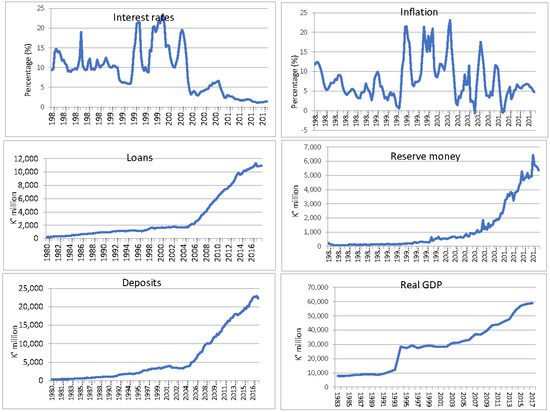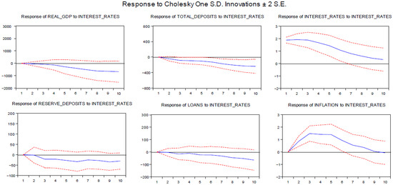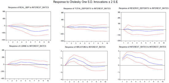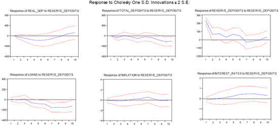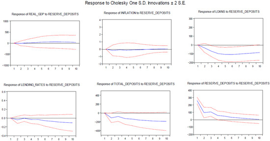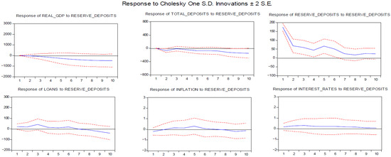 The variables entering the VAR system are treated as endogenous, which addresses the problem of endogeneity. The variables to be included in the VAR are usually selected according to the economic rationale or the relevant theory. For the functional form of the model, we turn to the Cholesky decomposition, propagating the shocks with the following ordering: real GDP; bank deposits; reserve money; loans; inflation; and interest rates.