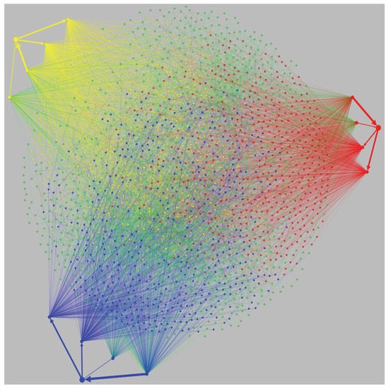 Figure 10 shows a visualization of the cyclic structure for a case where (EUBOF 2021). Each node shown is a firm or an individual. The arcs of the graph denote bilateral obligations (IOUs), not currency flows. The picture does not show all the obligations between these roughly 3000 points, it only shows the obligations that can be cleared with (red, blue, yellow) or without (green) the liquidity sources. To utilize multiple liquidity sources, the exchange rate must be set to an agreed unit of account (e.g., the Euro) for each party at the moment of clearing, which is near-instantaneous. Yellow could represent fiat held in bank accounts, red CBDC balances, and blue cryptocurrencies. A fourth source could be added representing mutual credit.