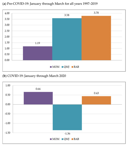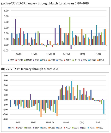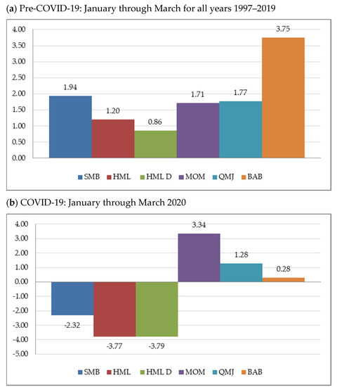 This section provides an international comparison of the risk factors’ performance between the problematic period defined by the first wave of the COVID pandemic, from 1 January 2020 to 31 March 2020, and a stable and long sample period pre-crisis that contains the first three months of each year between 1997 and 2019. The selection of the three first months is to control for potential seasonality effects that could make the two samples not comparable. First, in Section 3.1, the analysis provides descriptive statistics of factor returns. Then, alphas, estimated by the CAPM and the Fama–French models, are compared in Section 3.2.