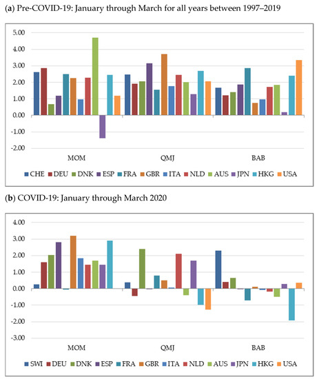 The analysis in Section 3 compares descriptive statistics and risk-adjusted returns for the different risk factors and countries between the COVID and the pre-COVID subperiods. The COVID subperiod is defined as the first quarter of 2020, coinciding with the first wave of the pandemic. The pre-COVID sample comprises the first quarter of each year between 1997 and 2019. The idea is to contrast the behavior of an exogenous crisis with a relatively long sample period controlling for the potential seasonality associated with the first months of the year.