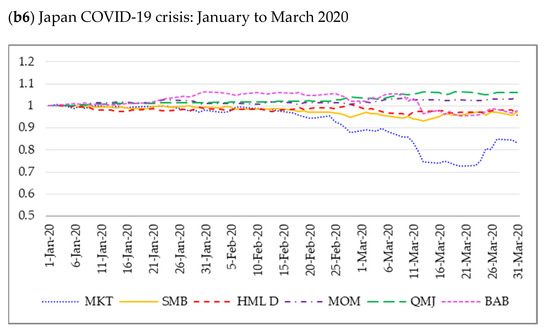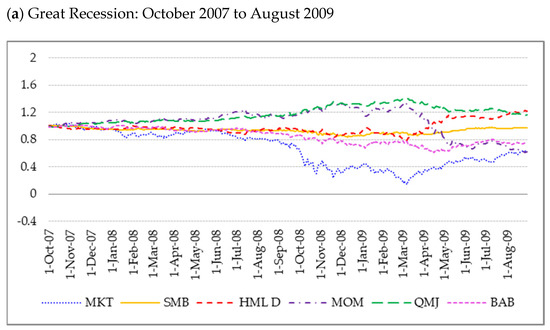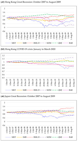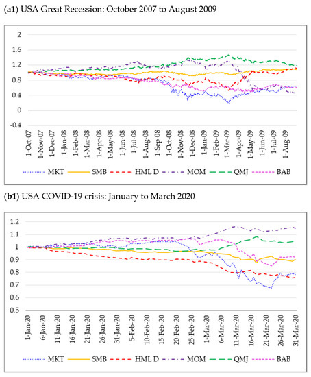 Figure 5 and Figure 6 show the time series evolution of cumulative returns along each subperiod for the global market and the six selected countries, respectively. Starting with the global index in Figure 5, the different effect of the two crises in the value and momentum factors is mentionable. During the Great Recession, the HML D factor shows a stable cumulative return that even starts increasing from March 2009 while, except for the market, it is the worst performer during the COVID crisis. On the contrary, the MOM factor shows an increasing trend during late 2007 and 2008 but experiences a big fall in March 2009. However, the MOM strategy supports very satisfactorily the COVID adverse shock, showing increasing cumulative returns during the first quarter of 2020. The QMJ factor shows consistent good behavior during the two crises.