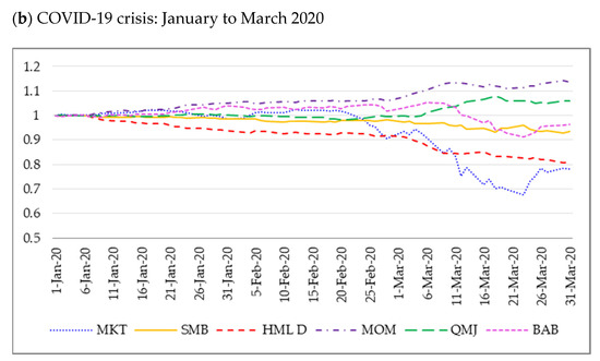 To summarize, in the full first-quarter sample period from 1997 to 2019, which can be identified as the normal-time, the global BAB and MOM risk factors are the star performers. During the worst months of the pandemic crisis, the QMJ risk factor and, once again, the MOM factor have not only positive average returns, but also extraordinary Sharpe ratios relative to the overall market performance. On the negative side, the value factors present the worst performance in both normal and bad economic times.