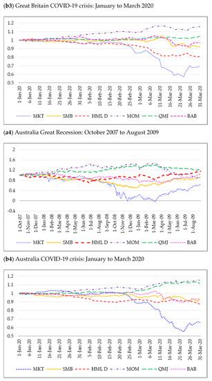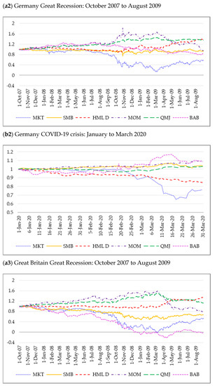 This pattern between both subperiods is also found for the SMB, HMLs, and BAB risk factors. The cumulative performance of these factors is clearly more negative during the COVID-19 than during the Great Recession for both the global index and most countries. The impressive exception is the BAB in Germany during the first quarter of 2020. If the BAB factor reflects funding liquidity, the result suggests that investors discounted the extraordinary capacity of the German economy to provide direct financial resources to German companies. The cumulative behavior of the MOM factor is once again striking. Overall, the MOM factor presents the worst performance among the six factors analyzed during the Great Recession. However, the cumulative performance of the MOM factor during the COVID-19 subperiod is amazing. The momentum strategy experiences positive results in all the countries, especially in the cases of the Great Britain, Australian, Hong Kong, and USA stock markets. This evidence is consistent with the average results reported in previous sections. Moreover, given its hedging nature, as shown by Asness et al. (2019), the cumulative performance of the QMJ factor in both crises is positive both globally and across markets. Overall, the QMJ factor performs better in the COVID-19 pandemic than in the Great Recession, with especially good relative performance for Australia and Japan.