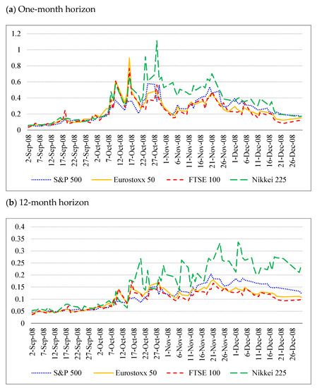 Figure 7a,b display the expected market risk premia for the one-month and 12-month horizons, respectively, of the four stock markets during the four months corresponding to the Great Recession. Firstly, it is important to point out that the expected market risk premium at the shorter horizon is higher than the expected premium at the longer horizon for the four markets. This is true not only on average, but also during the more distressing days. All estimates follow a well-behaved counter-cyclical pattern, but there are relevant differences across markets. At the shorter horizon, the expected market risk premia of the two European markets and Japan react more deeply than the USA market during the initial days of the crisis. After that, the European countries and the United States follow a similar pattern, with peaks of similar magnitudes while the expected market risk premium of Japan remains above that of the other three markets. In any case, the four markets show a consistent declining pattern for the expected market risk premium from mid-November onwards. In contrast, at the 12-month horizon, the Japanese expected market risk premium remains relatively high even during the final days of the sample period. The declining expected risk premia for the other three markets at the 12-month horizon show smoother decreasing behavior than for the one-month horizon.