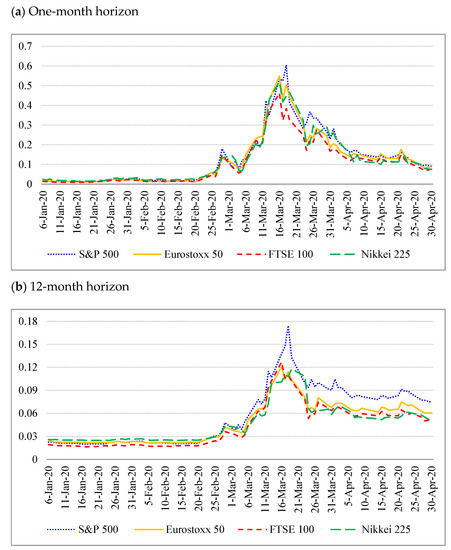 Figure 8a,b refer to the COVID-19 subperiod. The two panels emphasize the extraordinary surprise of the pandemic in the four stock markets. There is an initial upward push at the end of February, and a big jump around mid-March. After that, the expected market risk premium for the one-month horizon shows a quick and permanent decline in the four markets. However, the expectations for one-year ahead remain at a relatively high level. Unlike during the Great Recession, Japan is not the country with the consistently highest expected market risk premium. In this case, the USA market has the highest risk premium peaks at the one-month horizon but specially at the 12-month horizon. Therefore, it seems that the stock market in the USA is strongly and negatively influenced by the high uncertainty of the health crisis over a long horizon compared to other markets around the world.