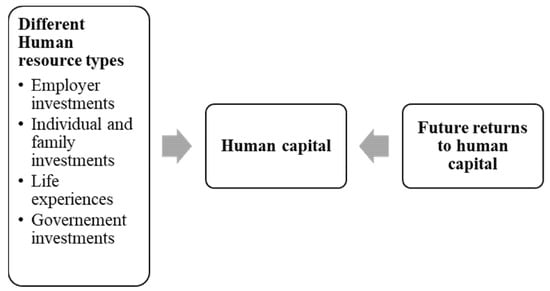 Investments in human capital are closely connected with the level of education of employees or business owners as the potential of the firm or country development and investments for the future (Ashenfelter et al. 2003; Hazelkorn and Huisman 2008). Those investments influence the future development of human capital, as illustrated below (Figure 1). Stroombergen et al. (2003) identified the following four different sources of investments into HR: when employer investments include courses and training, learning by doing activities; individual and family investments based on tuition fees payments during studies, and government investments covering public costs on education. A future return on human capital could be calculated as future earnings from new capabilities or innovations; secondly, it could be considered as value added to the employee’s life.