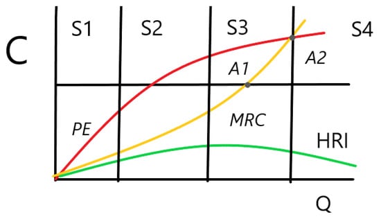 Mikhailov and Miasnikov (2019) described the situation between investment costs (C) and productivity (Q) during different stages of the company. It is necessary to set the cost limit as represented by CL horizontal curve to be effective on both sides. Production effectivity is represented as a PE curve, and it means effective use of resources. Secondly, the model compares the MRC curve, expressing maintenance and repair costs needed for production. Thirdly, the HRI curve simulates willingness to invest in human capital (in the number of investment costs). Two non-effective situations are expressed here: (1) A1 situation, when MRC is reaching limit costs (CL) under sufficient and profitable production; (2) A2 situation, when PE = MRC and it means that production costs are not compatible with the criteria of efficient use of equipment. The relationship between those variables is simulated in Figure 2.