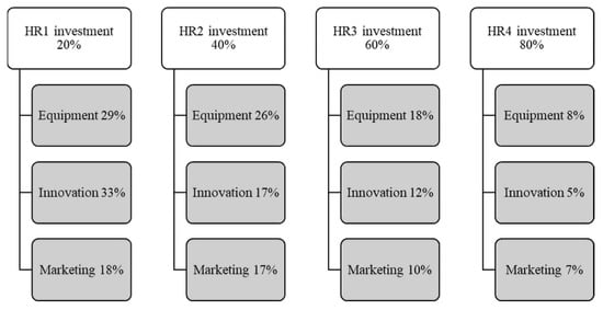 According to those findings, we can specify four investment portfolios, where the most crucial element is HR investment. Portfolios illustrate investment preferences during business activities, which is connected with Figure 2 and the stages model (Mikhailov and Miasnikov 2019). HR1 group is closely connected with stage 1 (S1), where business owners are focused on technology and equipment to produce innovation. Following that, a need for skilled employees arises in group HR2, copying stage 2 (S2), but a need for competitive advantage on the market is necessary to arise investments within groups HR3 and HR4 (S3 to S4 stage) (See Figure 3).