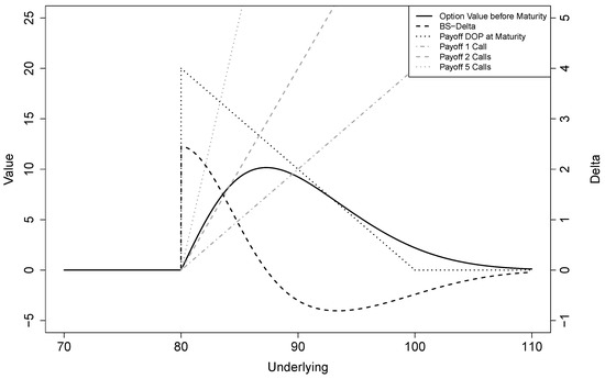 Value, Black–Scholes delta and payoff of a down-and-out put with strike price and barrier , 20 days before maturity. Additionally, payoffs of 1, 2 and 5 vanilla call options with strike equal to the barrier of down-and-out put are shown.