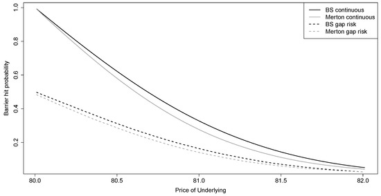 Figure 2 shows the hedge ratios and absolute and relative root mean squared error (RMSE) for the seven hedging strategies, dependent on the current price of the underlying for a discrete one-day hedge of a down-and-out put with barrier , strike price and 20 days to maturity. The hedge ratio of a classical Black–Scholes delta hedge reaches a value of about near the barrier. In contrast, hedge ratios for all mean-variance approaches become smaller and tend to zero when the price of the underlying approaches the barrier from above. The reason is that the probability of a barrier crossing becomes very high close to the barrier, and a high delta would lead to a large hedging error in the event of a barrier break. Figure 3 visualizes the barrier-hit probabilities, dependent on the underlying price. This probability also explains why the mean-variance deltas and the Black–Scholes delta converge for higher underlying prices, where barrier breaks are very unlikely within the hedging period. Looking at absolute RMSEs, the Black–Scholes delta and the static approach are virtually identical and lead to the highest errors of all strategies, with a maximum of at . When the probability of hitting the barrier within the hedging period is very high, even the no-hedging strategy results in smaller errors than a standard delta hedge (at underlying prices of 80.50 and below). The best hedging results can be achieved by the mean-variance strategies with a hedging error of at . As all mean-variance deltas are very small, the main driver of the hedging error is now the rare event when the dop is not knocked out. While using the 1-day vanilla call results in the best performance, the differences to the other mean-variance strategies are not as large. As long as the barrier-hit probability exceeds (at underlying levels below ), all mean-variance strategies outperform the standard delta and the static hedge. Relative RMSEs explode close to the barrier and take values of up to 100 for the standard delta and static hedge and values of 12 for the other strategies. However, since the RMSE is scaled by the price of the down-and-out put, which tends to zero as the underlying price reaches the barrier, these values are of little relevance here.