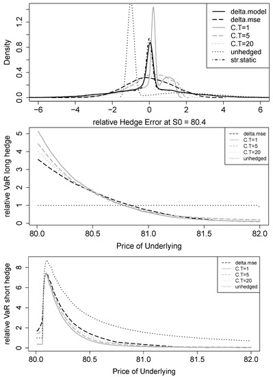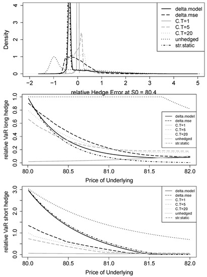 Regarding relative VaR, it is important to distinguish whether a long or a short dop is hedged. The reason is the different source of high errors. If a long position is hedged, high errors occur when the barrier is hit during the hedging period. In this case, no hedging actually yields the best result, as the maximum loss is the value of the dop (100%). The Black–Scholes delta and the static hedge yield extreme relative VaRs of more than 10,000% and are therefore not shown in Figure 4. Compared to these extreme values, all MSE strategies yield significant improvements. Interestingly, for underlying prices of and below, the hedge with the underlying outperforms the hedges with the vanilla calls. In contrast, in the more relevant case for practice where a short position is hedged, high errors occur when the barrier is not hit. Here, the MSE hedges with vanilla calls result in best performances. However, differences between the MSE strategies are small unless the hedge is initiated only a few cents away from the barrier. As before, Black–Scholes delta and static hedging VaRs are extreme and therefore not plotted.