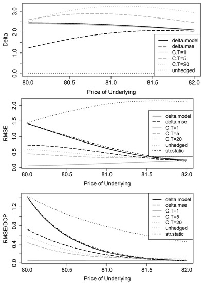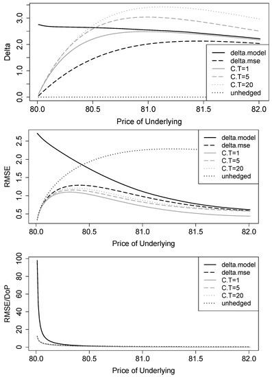 Figure 5 summarizes the results for hedge ratios and absolute and relative RMSEs for the different strategies in the case of a trading gap within the one-day hedging period. The main difference to the continuous world from the previous section is that now hedge ratios of the mean-variance strategies do not tend to zero near the barrier. This is because now the down-and-out put value in is significantly higher than in a continuous setting because barrier-hit probabilities are much lower (about 50% compared to almost 100%; see Figure 3). The mean-variance delta using the underlying is still smaller than the Black–Scholes delta and has its minimum at compared to the Black–Scholes delta of at an underlying price of . for call options that mature at the end of the hedging period of one day is almost identical to the Black–Scholes delta. This is also plausible, because the most problematic scenario when is below B yields a hedging error of zero, since both the call option and the down-and-out put have no payoff. For , the option delta is exactly one and thus yields the same precision as the Black–Scholes delta for the “good” case of no barrier break event. and are somehow larger, because deltas of these options are less than one, so more options are needed to eliminate the same amount of price risk.