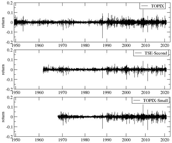 Our analysis is based on the daily price data of three indices of Japanese stocks traded on the TSE. (1) TOPIX: an index based on all domestic common stocks listed in the TSE First Section. (2) Tokyo Stock Exchange Second Section Index (TSE-Second): an index of all domestic common stocks listed in the TSE second section. (3) TOPIX-Small2: an index based on small-sized stocks, excluding the 500 most liquid and highly market-capitalized stocks. The data were retrieved from the JPX data cloud (http://db-ec.jpx.co.jp/, accessed on 12 May 2021), and the time periods of the data used for the analysis are listed in Table 1.