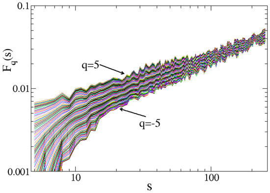 for each segment . Here, is the fitting polynomial to remove the local trend in segment ; we use a cubic order polynomial. Averaging over all segments, we obtain the qth order fluctuation function