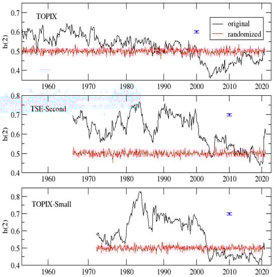 It is observed that before 1970, of TOPIX was greater than 0.5, indicating that the TOPIX market has persistency and is thus inefficient. of TOPIX gradually decreases, and it appears that reaches 0.5 around the 1980s, indicating that the market becomes efficient. However, of TOPIX decreases further to less than 0.5 after around the year 2000, indicating anti-persistency. This anti-persistence was also observed by (), and it persists until today. The values of the TSE-Second and TOPIX-Small took a value greater than 0.5 before 2000, indicating that the time series are persistent. Both the values of the TSE-Second and TOPIX-Small decreased at the beginning of the 2000s and the of TSE-Second reached approximately 0.5, indicating that the TSE-Second market has become efficient.
