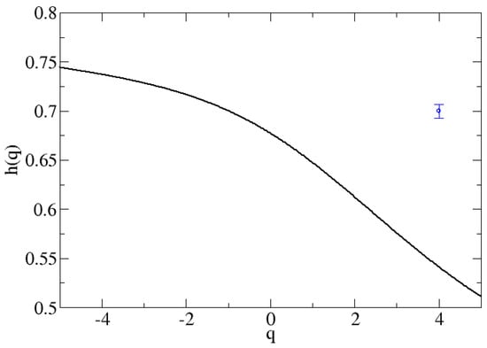 The GHE is determined by the scaling exponent . corresponds to the HE H, and for (), the time series is classified as anti-persistent (persistent). When varies with q, the time series is multifractal. Conversely, when is constant for any q, the time series is monofractal. We restrict the range of q in because when is large, the moments in the fluctuation function could diverge, and the calculation of might be unstable ().