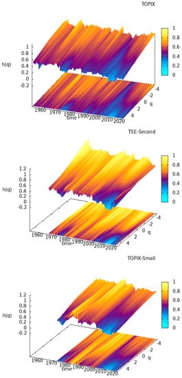 Next, we examine the multifractal properties by the GHE, . Figure 4 is a representative of as a function of q at the first time window of the TOPIX time series. In Figure 4, we find that is not constant, thereby showing the multifractality of the time series. To investigate the time evolution of , we show in three-dimensional plots in Figure 5; we recognize that the values of the three indices at any given time are not constant, exhibiting the multifractal nature of the return time series. The functional form of varies considerably over time, causing the surface of on the q-time plane to fluctuate. Before 2000, the area with , represented in yellow and orange, dominated the others. After 2000, the area with , represented in blue and light blue, has expanded. These results suggest that the market status by multifractality changed substantially in around 2000, which is possibly attributable to the complete migration to the TSE’s computer trading system and the financial system reform, also seen in .