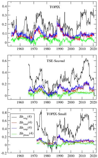 where and are the degree of the multifractality for original and randomized time series, respectively. Taking , we plot and in Figure 6. In addition, to investigate the contribution of linear correlations to the multifractality we calculate the degree of the multifractality for the surrogate time series (; ) and also plot the results in Figure 6 as and . is obtained from the phase randomized surrogate time series, which eliminates the distributional properties and time correlations, except for the linear correlation. is obtained from the amplitude adjusted surrogate series which keep the linear correlation and the distributional properties. We generate 20 surrogate time series for each time window and calculate averages of the GHE over those time series. The amplitude of is found to be small, meaning that the contribution of linear correlations to the multifractality is small. We find that and have a similar time variation, which also indicates that the contribution of linear correlations is small, and thus and mainly exhibit the degree of multifractality from the return distributions. As typically is larger than , contains the contributions from complex non-linear correlations. takes mostly non-zero values and varies over time, implying that the return distribution contributes to the appearance of the multifractality, and the form of return distribution may vary over time.