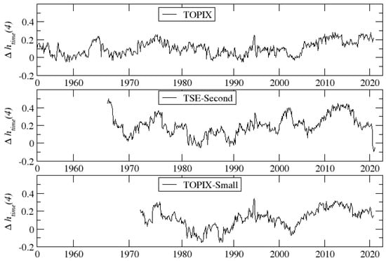 As seen in Figure 7, varies over time, and there is no indication that converges to zero, meaning that the Japanese markets are inefficient. It especially contrasts with of TSE-Second, showing that the recent market is efficient only judging by . Our observation implies that multifractality is induced by complex time correlations uncaptured by HE alone, and the Japanese stock markets quantified by the multifractality are inefficient.
