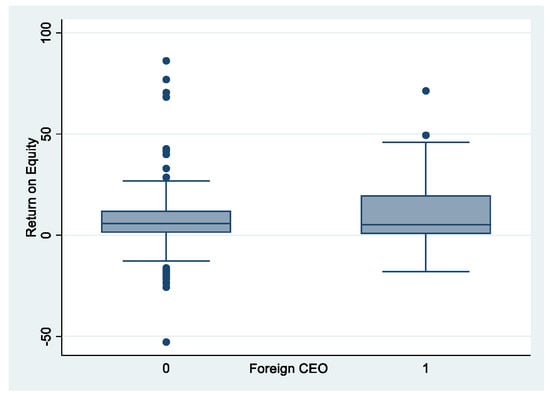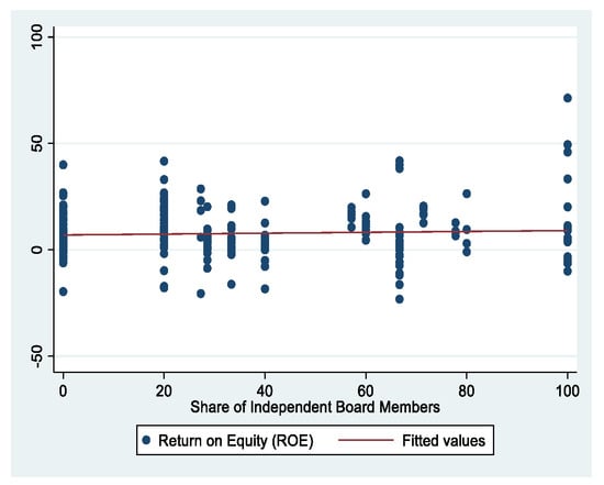 Table 3 presents the correlations of the three sets of independent variables (i.e., board diversity measures, CEO characteristics, and board committees). In the case of the board diversity indicators, only one of the performance indicators, i.e., return on equity (ROE), has statistically significant correlations with some indicators—namely, ROA and Tobin’s Q do not display any statistically significant bivariate relationship with the diversity measures. However, in the case of ROE, the shares of both independent and foreign members are positively associated with this performance indicator at the 5% statistical significance level. In the case of the CEO characteristics, ROE is again positively associated with the presence of foreign CEOs. Finally, in the case of board committees, the number of board committees is not correlated with any of the performance indicators in a statistically significant way. However, ROA and Tobin’s Q display positive correlations with the number of members in different board committees. Overall, the correlation results in Table 3 provide some initial insights on the possible effects of board diversity in terms of independent and foreign board members and the different committees. Figure 1 and Figure 2 provide some graphical evidence in support of these findings.