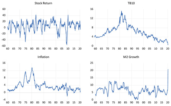 While the data are well known, from Figure 1, we can observe significant market drops in the early 1970s, including those associated with the oil price shock of 1974, two notable bear markets in the 1980s including the October 1987 crash, the dotcom crash of the early 2000s and the financial-crisis-related crash of 2008–2009. As the data are annualised, the COVID-19-related crash is not evident here; however, in the monthly data, we can observe a 20% fall in March of 2020. In the other series, we can see the secular decline in interest rates since the highs of the early 1980s and reaching unprecedented lows following, first, the financial crisis and then the COVID-19 pandemic. In the inflation series, we see the highs that were spurred on by the oil price shocks of the 1970s. The 1980s were marked by policy designed to control inflation before a period of general price stability in the 1990s and 2000s, which appeared to end just prior to the financial crisis, with inflation in the post-crisis period subdued. The most notable aspect regarding M2 money supply growth is the huge increase associated with the COVID-19 pandemic, dwarfing previous increases.