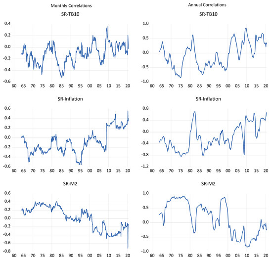 We begin by examining the correlation between stock returns and the 10-Year Treasury bond yield (TB10), inflation and M2 money supply growth. Using both monthly and annualised data over the period from 1959 to mid-2020, we estimate the correlation coefficient over 5-year windows. Our results reveal that the correlation between stock returns and TB10 and inflation are predominately negative from the start of the sample but become increasingly positive following the dotcom crash and, especially, the financial crisis. The correlation between stock returns and money supply growth follows the opposite pattern, predominantly positive prior to 2000 and predominantly negative afterwards. Moreover, shifts in correlations appear to take place around periods of economic crisis.