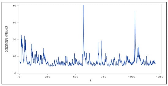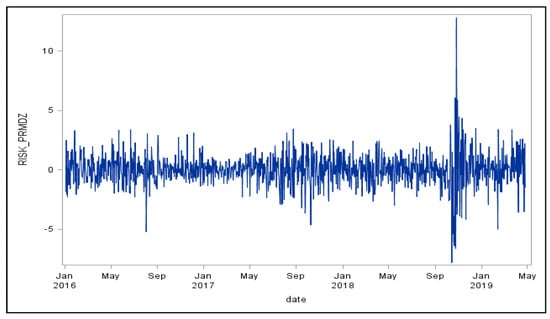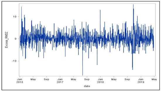 From the parameter estimation of the GARCH model (Table 8), it can be seen that all the p-values are less than 0.05, so all the parameters are significant. Figure 5 shows conditional variance data Excess_RMDZ where conditional variance is highly relative in 2016, April 2018, November to December 2018, and relatively high on January to March 2020.