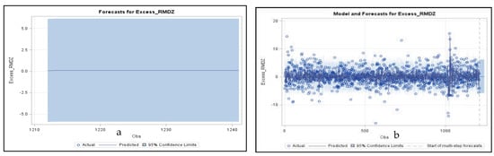 (a) Forecasting for data Excess_RMDZ and (b) model and forecasts for Excess_RMDZ Adaro Energy, Tbk.