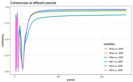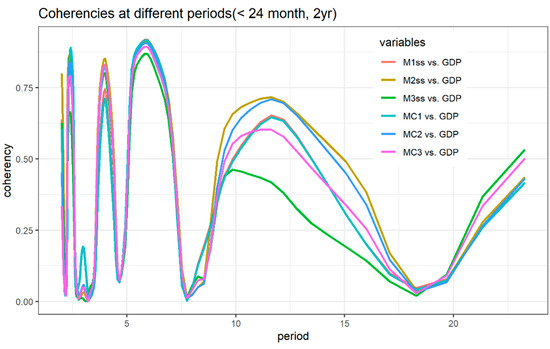 Figure 7 and Figure 8 depict the coherencies between different monetary aggregates and nominal GDP. By focusing on the coherencies with short periods, Figure 8 provides more accurate numerical results for short-term coherencies.