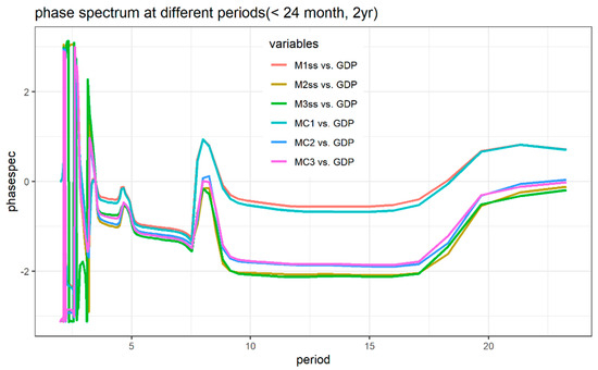 Figure 9 and Figure 10 depict the phase differences between different monetary aggregates and nominal GDP. By focusing on the phase differences during short periods, Figure 10 provides more accurate numerical results for short-term phase differences.