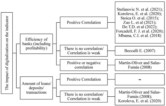 Researchers are obtaining controversial results for this topic. A generalized overview of the results of research on the impact of digitalization on the performance of banks is presented in Figure 1.