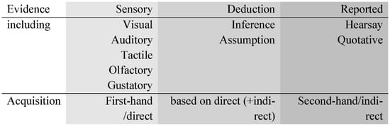 In this paper, the evidential strategies in the data are classified using a modified version of the model introduced by Chafe (1986) that is quasi-analogous to the systematization of evidentials in E1-languages in the respect that it proposes a progressive hierarchy based on knowledge reliability. Whilst Chafe differentiates four modes of knowing, viz. belief, induction, hearsay, and deduction, the proposed model in this paper for German as an E2-language excludes the category of belief, arguing that belief is so deeply rooted within epistemic modality and detached from fact that it cannot possibly constitute an evidential category. Additionally, it was deemed necessary to opt for a supercategory that entails both hearsay and quotation viz. “reported”, since grammatical distinctions between quotative and hearsay evidence are often not present in the aforementioned E2-languages and distinctions between ambiguous hearsay and direct as well as indirect quotations are bound to the same evidential strategies here. The same applies also to inference and assumption: On the one hand, there is a clear distinction between both categories in the sense that inference relies on first-hand acquired evidence that directly motivates a deduction, whereas assumptions do not have a direct connection between what is being witnessed and what it being implied, thus relying on second-hand evidence. On the other hand, both are often used with the same evidential strategy and are thus often only differentiable through qualitative analysis. However, since contextual constraints may hinder these determinations in many cases, it was decided to follow Chafe’s suggestion to subsume both inference and assumption in the supercategory “deduction” for German as an E2-language. In accordance with that the supercategory, “sensory” will be used to describe any form of evidence directly acquired by a speaker, since E2-languages do not draw a binary distinction between a visual and a sensory category. This creates the following model denoting the trinomial segmentation of evidentiality in E2-languages to which German belongs (Figure 1):