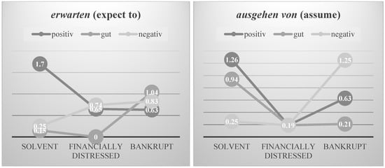 Scanning for verbs with encoded evidential meaning introducing that-clause constructions of bankrupt companies produces the highest frequency with the same two verbs previously introduced. Although ausgehen von occurs with a slightly raised normalized frequency of 77.93 here, erwarten occurs almost twice as often as in the solvent dataset, displaying a normalized frequency of 76.27 that is on par with ausgehen von. Looking at adjectives carrying evaluative meaning co-occurring with the erwarten/ausgehen von + dass constructions produces very different results as well: ausgehen von has the adjectival collocates positiv and negativ with normalized frequencies of 0.63 and 1.25, but displays a very low frequency of 0.21 for gut, whereas erwarten has gut co-occurring with a comparatively high frequency of 1.04. However, looking at the actual data, it is revealed that these co-occurrences all stem from the exact same sentence, illustrated in (22), that occurs in various financial statements of the same company throughout the years, tainting the significance of the heightened frequency here. The exact same issue can be observed for the co-occurrence of positiv with erwarten + dass in this dataset, where the repeating sentence is (23). The frequency of negativ following the erwarten + dass constructions displays no such issues and is 0.83 per million words. Whereas the vast majority of negativ’s patterned co-occurrences turned out to be double negatives in the solvent dataset, the bankrupt dataset is different: though a small number is still comprised of negative deductions weakened by negated intensifiers (17) or negating the deductions itself (18) and thus rendering the deduced outcome desirable, (20) and (21) are explicitly negatively evaluated and others carry temporality markers such as derzeit (currently), implying the speaker’s prediction may change if contradictory evidence occurs in the future. Other markers that weaken the deduction can be found in (19) and (20): in (19) the premodification of ausgeglichen (offset) with the approximator annähernd (approximately) implies uncertainty of the speaker’s prediction as does the modal adverbial clause in (20): although the speaker expresses a high degree of certainty (hohe Wahrscheinlichkeit) that their deduction is true, it is still a comparatively weaker claim than the deduction illustrated in (21) that is devoid of it. What stands out in all these patterned co-occurrences is the absence of explicit evidence realized by adverbial phrases that was prominently featured co-occurring with the use of evidential strategies in the dataset of solvent companies.