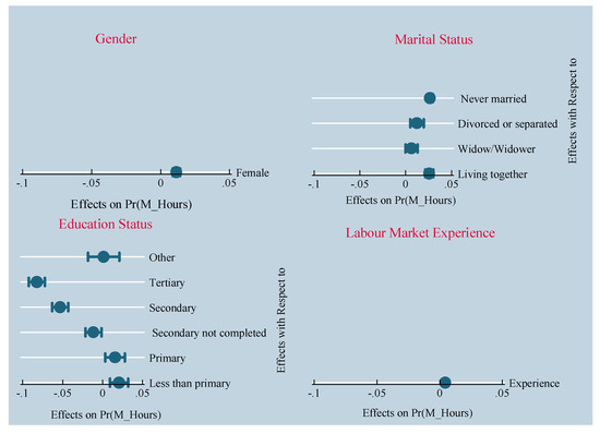 There are numerous social benefits that can be encountered as a result of this current research due to the valuable nature of this study and the particularities of the case study chosen for analysis. First, the findings of this study come to support the results existing in the international specialised literature which place, as a top priority for organizations at a global level, human resources (HR), intellectual capital (IC), and intellectual property (IP). Second, this study emphasises the paramount influence that United Nations SDGs have on the labour market, since there are numerous pivotal areas that are profoundly influenced by the aims specific to the Global Goals (GG): on the one hand, the labour market is dependent on individuals’ level of health and the capacity to foster well-being and happiness and, on the other hand, the labour market is linked to the society’s capacity to transform information into key knowledge, hence ensuring access to quality education and training, equality at the place of work, decent possibilities to work, decent jobs, creativity, innovation, and scientific development. Third, this study is majorly dependent on the ability of leaders and managers to generate and maintain responsible behaviour, responsible activities, and responsible decisions in the labour market. To summarise, in other words, this novel and original study brings to the attention of individuals, entities, and leaders worldwide the importance of the opportunities embodied by the labour market especially in times of crisis, in delicate situations, that require particular attention in terms of social and economic needs. In this case, individuals’ desire and/or need to work more hours if paid, might have roots in different situations, such as, for instance: people’s necessity to become financially independent, employees’ desire to make themselves remarked through their work at their place of employment in order to have better chances to be promoted faster and in higher positions, or people’s inclination to feel needed and rewarded accordingly. In conclusion, the results of this study are very interesting and, at the same time, eye-opening, since they point out some of the particularities of the labour market in the case of South Africa: for instance, based on the data analysed, being female increased the likelihood of willingness to work more hours if paid by 1.1 percentage points; also, being never married increased that probability by 2.7 percentage points; moving on, within education categories, the highest coefficient in magnitude, having tertiary education decreases the probability of willingness to work more hours by 8.2 percentage points; furthermore, as an important labour market indicator, one more year to commence working increases the probability of willingness to work more hours if paid by 0.4 percentage points (see Figure 3: The effects of working more hours if paid in today’s social and economic context).