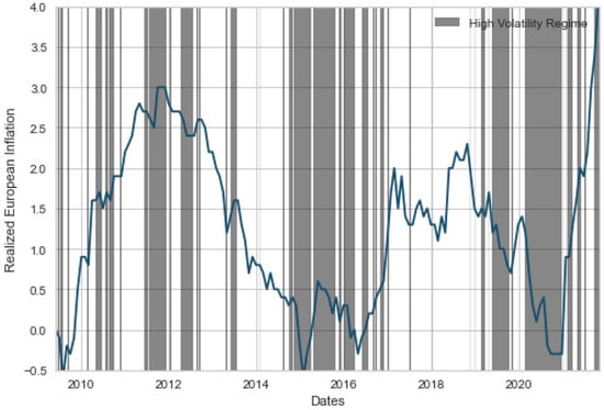 To our knowledge, no other work has been conducted to identify regimes of market participants’ inflation forecasts in the Euro area, however, similar works may exist on realized inflation data at lower frequency (see () for instance) and for implied inflation in the US (see ()). To address this issue, we conduct specification tests to ensure robust parametrization (let us recall that we showed in Section 3 that the choice of a non-linear model is justified). We use a consistent selection criterion that penalizes complex parametrization, namely the Bayesian Information Criterion (BIC), to select the number of regimes and the number of autoregressive terms to be used in our model. It appears that the model minimizing our selection criterion includes two regimes and one lag but no intercept. This result is consistent with other studies investigating Markov switching models (with different specifications) on CPI data and finding two regimes, see for instance () and (). In this context, we recall that one can compute the expected duration of regime i, denoted by , using transition probabilities to assess the persistence of each regime: