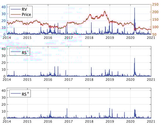 The daily price, RV, and each RS for the energy resource sector are shown in Figure 1. Table 2 displays the descriptive statistics of RV and RS for each sector in the pre-COVID-19 and COVID-19 periods. We indicate that increases in mean, standard deviation, maximum, and minimum values of RV and RS are observed across almost all sectors during both the pre-COVID-19 and COVID-19 periods. These statistics of negative RS are also larger than positive RSs for the pre-COVID-19 and COVID-19 periods.
