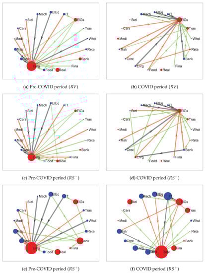 Finally, regarding positive RS, in the pre-COVID-19 period, the total volatility spillover is , and in the COVID-19 period, it is (Table 5). This is also applies to RV and negative RS. Furthermore, total volatility spillovers based on positive RS in both the pre-COVID-19 and the COVID-19 periods are smaller than total volatility spillovers based on negative RS. This indicates that negative RS has a greater effect than positive RS. Based on RV and a negative RS, the total volatility spillovers, the bank sector increases net spillover between the pre-COVID-19 and COVID-19 periods, and the finance sector has positive net spillovers in both periods. The net spillover of the bank sector also increases from to for the total spillover based on positive RS, but the net spillover of the finance sector decreases dramatically from to . There are some distinctions between Figure 2e,f. First, in the pre-COVID-19 period, each sector’s net spillover is relatively larger than the negative RS and RV, but the network shape is similar to their networks. Second, this is the most significant difference during the COVID-19 period. Some major net pairwise spillovers are sent to the electricity/gas sector in RV and negative RS. However, the real estate sector receives positive RS. Furthermore, the energy resource sector becomes a net transmitter. From the above, the energy resource sector is the largest net receiver during the pre-COVID-19 period, whereas the electricity/gas sector becomes the largest net receiver during the COVID-19 period. Moreover, the energy resource sector becomes a net transmitter during the COVID-19 period. Additionally, the network based on positive RS during the COVID-19 period is clearly different from networks based on RV and negative RS. However the shapes of the negative RS and RV networks are almost identical. These results indicate that the influence of positive RS is limited under the volatile situation.
