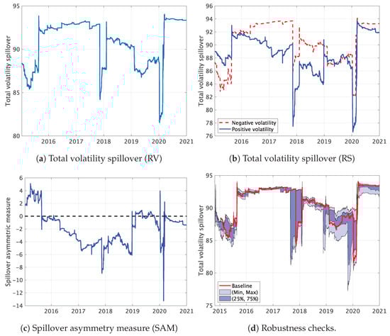 Figure 3d presents the total time-varying volatility spillover based on each combination. The red line (baseline) is , , and . The dark and light blue areas indicate the and quantiles and the minimum and maximum values of the obtained distribution. When the total volatility spillover is large, the estimation is more robust. Additionally, even when the total volatility spillover is small, the range of is narrow and includes the baseline values almost at all times. Moreover, when the total volatility spillover is extreme, the estimated values are close to the baseline. Therefore, our empirical results are not sensitive to the choice of parameters.