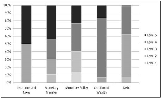 Figure 5 shows that the highest level (level 5) is underrepresented, especially in the areas debt and creation of wealth, whilst both of the lowest levels (level 1 and level 2) are overrepresented in the areas of debt. Deficits can be spotted in the field of monetary policy as well. Here, on average, the test persons remain below the medium level 3.