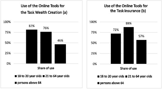 As expected, it becomes evident that the oldest group of the respondents, the people aged above 65, use the offered online tools the least. The differences in usage appeared in both decisions and were obviously independent from the decision area or the type of offered aids. Furthermore, we conducted an ANOVA for each area with the dependent variable share of respondents with use of the online aids and the independent variable age groups. Both results show a significant main effect of the age group (wealth creation: F (2, 209) = 6.71, p = 0.001; insurance: F (2, 209) = 8.42, p < 0.001). The ensuing Bonferroni post hoc test supported our assumption. The share of people aged above 65 that used the support of the online aids in decision-making differed significantly from the two other age groups in the two areas.