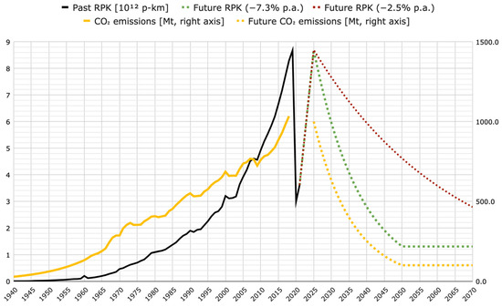 Revenue passenger-km (Ritchie et al. 2020; Airlines for America 2022) (black) and CO2 emissions (Sausen and Schumann 2000; Lee et al. 2021) (yellow, right axis); future developments of RPK and CO2 are discussed in Section 3 (dotted lines).