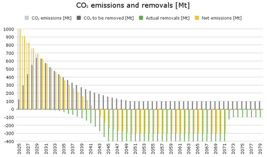 The baseline simulation of CO2 flows (Figure 2) shows the 2025–2030 ramp-up of emissions to be removed, the aggregate decarbonization of global aviation reaches its stable fair share along a 1.5 °C pathway by 2050 (dark gray), the 2025–2045 development of negative emission projects capped at aviation’s share (green), and the resulting net emissions becoming negative from 2042 (yellow), until all CO2 derived from aviation from 2030 has been removed by 2072; thereafter annual removals equal annual emissions.
