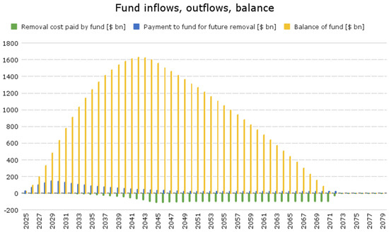 The baseline simulation of financial flows shows annual payments to the fund peaking in 2030 at $145 bn, before declining to USD 23 bn in 2050 (blue bars in Figure 3); CO2 removal needs time to develop and only peaks in 2045 at a cost of USD 112 bn, before stabilizing at USD 100 bn in 2050 (green); this delay allows NEFA to build reserves peaking at USD 1.63 trillion in 2042, before declining to zero in 2072 (yellow), when all CO2 emitted by aviation from 2030 onwards has been removed.